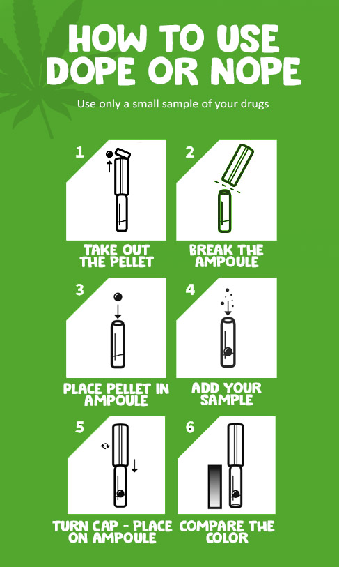 DOPE OR NOPE THC Test Kit is a fast and sensitive test that allows you to identify different types of drugs by specific discoloration and reaction rates. DOPE OR NOPE Test is an effective means against market pollution and can protect you against unwanted (side) effects.